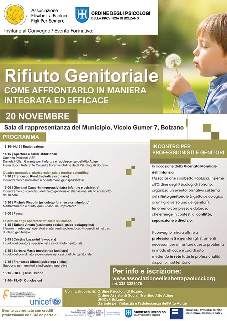 In occasione della Giornata Mondiale dell’Infanzia, l’Associazione Elisabetta Paolucci  e l’Ordine degli psicologi di Bolzano Invitano al convegno/evento formativo – Rifiuto genitoriale, come affrontarlo in maniera integrata ed efficace.