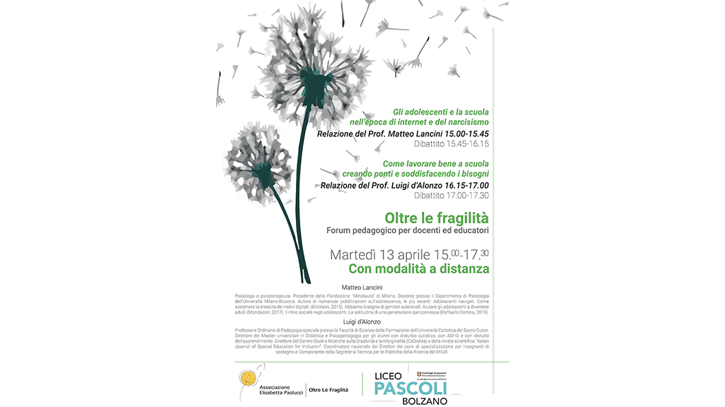 La prima edizione del nostro Forum “Oltre le Fragilità” ha preso vita grazie alla preziosa collaborazione con il Liceo “Giovanni Pascoli” di Bolzano. Questo incontro, pensato per docenti, educatori e genitori, ha acceso i riflettori su un tema di fondamentale importanza: le fragilità degli adolescenti e il loro profondo impatto sul mondo della scuola e sulle strategie didattiche.